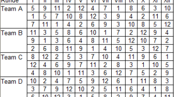 Ich füge mal ein beispielhaftes Lateinisches Quadrat für vier Mannschaften à drei Spieler bei.