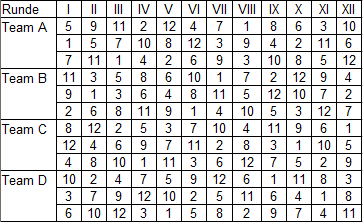 Ich füge mal ein beispielhaftes Lateinisches Quadrat für vier Mannschaften à drei Spieler bei.