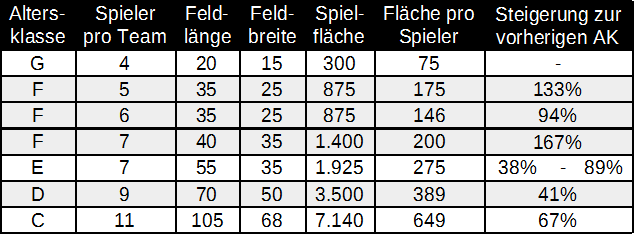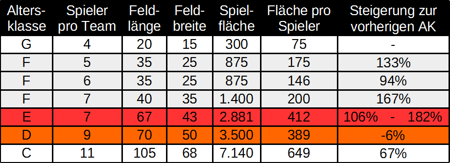 In der F-Jugend haben wir auf 40x25m Spielfelder gespielt (5+1) und nun mit nur einem Spieler mehr (6+1) ist das Spielfeld fast doppel so groß und meine Meinung nach, ganz schlecht für Kinderfussball.