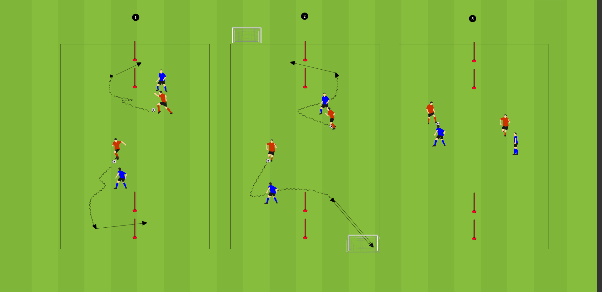 2.) Nun wird es schwieriger. Der Angreifer bekommt eine Möglichkeit zum Abschluss auf ein Minitor hinzu und die Situation ist wesentlich Spielnäher. Der Angreifer muss hier nach einem erfolgreichen Durchbruch auf der Innenseite einen präzisen Abschluss unter gegnerdruck abgeben (Man kann auch den "richtigen" Fuß einfordern). Dies ist eine große Herausforderung. Gleichzeitig fungieren die Minitore als Kontertore für die Verteidiger.