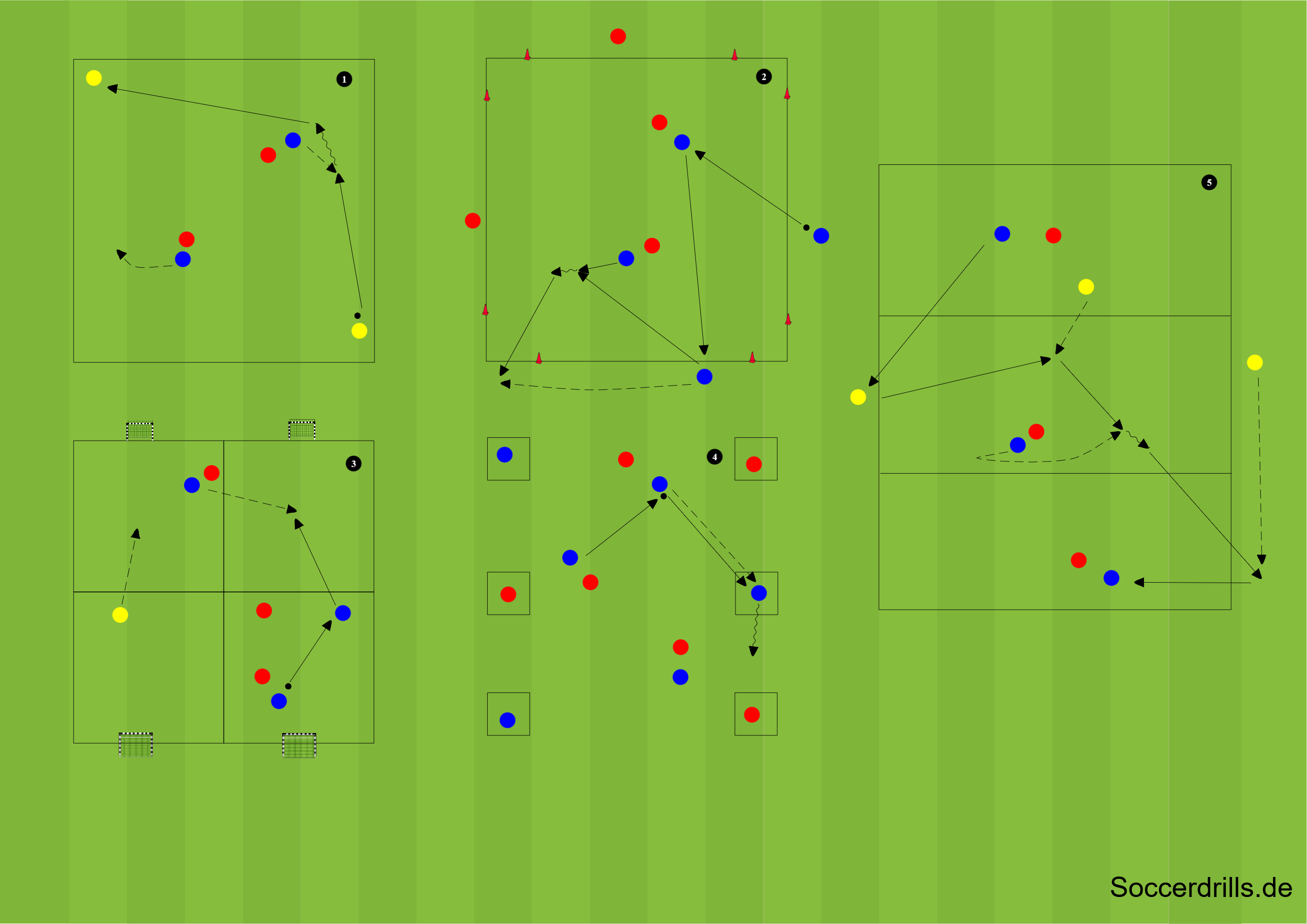 Die Spieler (2 Spieler im Feld und 2 Außenspieler) kombinieren untereinander gegen die 2 Feldspieler des anderen Teams. Nachdem jeder Spieler einmal am Ball war, werden die Passtore freigeschaltet und es kann ein Punkt erzielt werden indem ein Spieler im Feld durch ein Passtor einen Außenspieler des eigenen Teams anspielt.