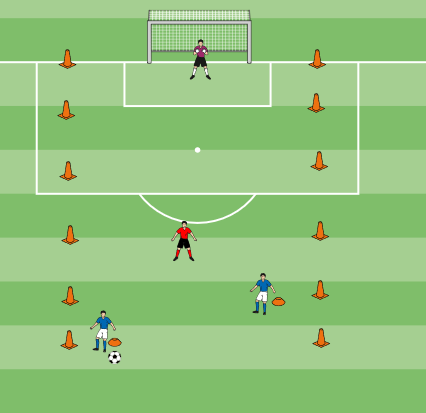 Es wird 2 gegen 1 auf ein Tor gespielt. Spieler A muss also abwägen, ob er ins Dribbling geht oder abspielt. Er muss also eine Entscheidung treffen und einen spielnahen Pass spielen.