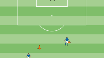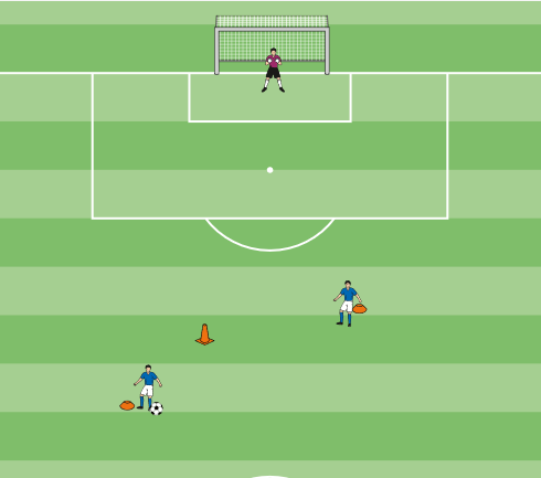 Es wird ein Pass von Spieler A auf Spieler B gespielt. Dieser nimmt den Ball mit und schießt dann aufs Tor.