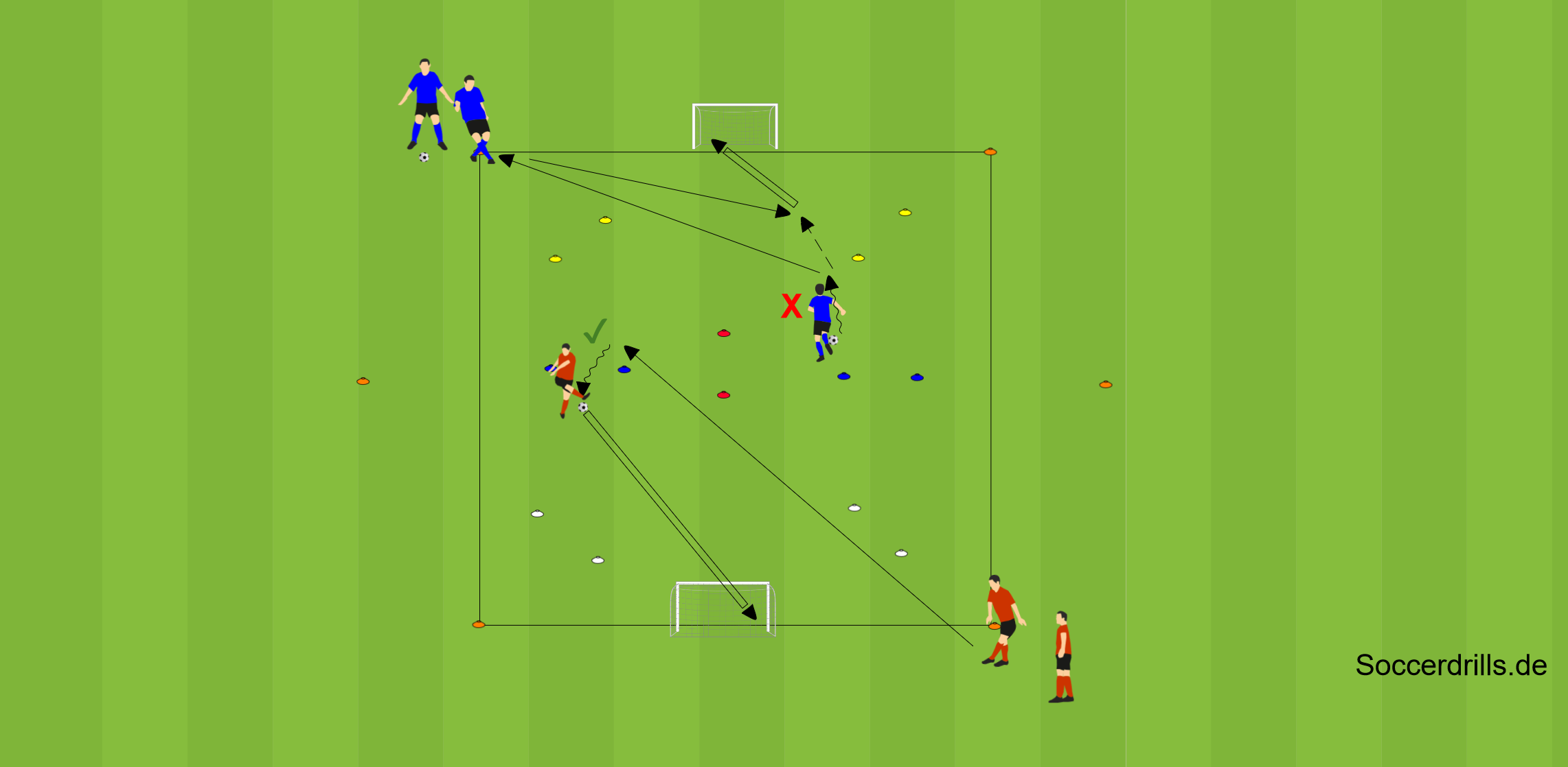 - nach 10 erfolgreichen Pässen darf blau auf das große Tor oder das Minitor (am anderen Ende des Quadrats, fehlt in Zeichnung) spielen