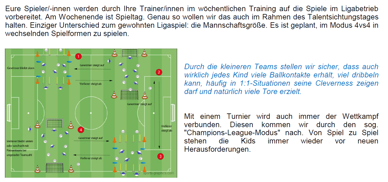 Ihr wollt talentierte Spieler für eine U11 sichten, die ab der U15 höher spielen sollen und habt mit 4 Trainern kein Konzept fürs Sichtungstraining