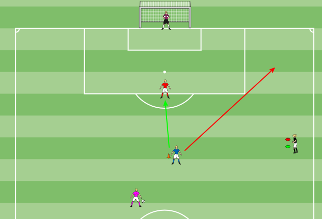 Blau steht mit dem Rücken zum Tor zentral und wird von Pink schräg angespielt. Im Moment des Anspieles soll sie mit dem Schulterblick zur Spielerin in Schwarz schauen, die entweder ein rotes oder ein grünes Hütchen hochhält. Grün heißt für die Spielerin in Blau das 1 gegen 1 gegen Rot mit Torabschluss. Grün heißt Aufdrehen und Pass raus auf Schwarz, die dann eine Flanke bringt.