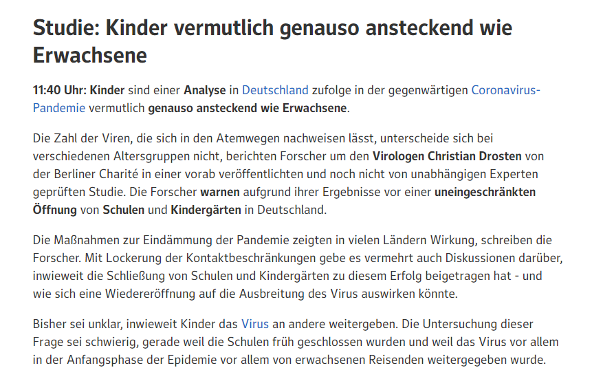 Also am Dienstag konnte man noch nichts dazu sagen - seitens der Berliner Charite - ob Kinder genauso oder weniger infektiös sind, aber einen Tag später schon? Wirkt nicht gerade als wäre diese Studie sehr seriös durchgeführt worden! Zumal am Ende des Artikels Drosten dann zum Teil seinen eigenen Ergebnissen widerspricht.