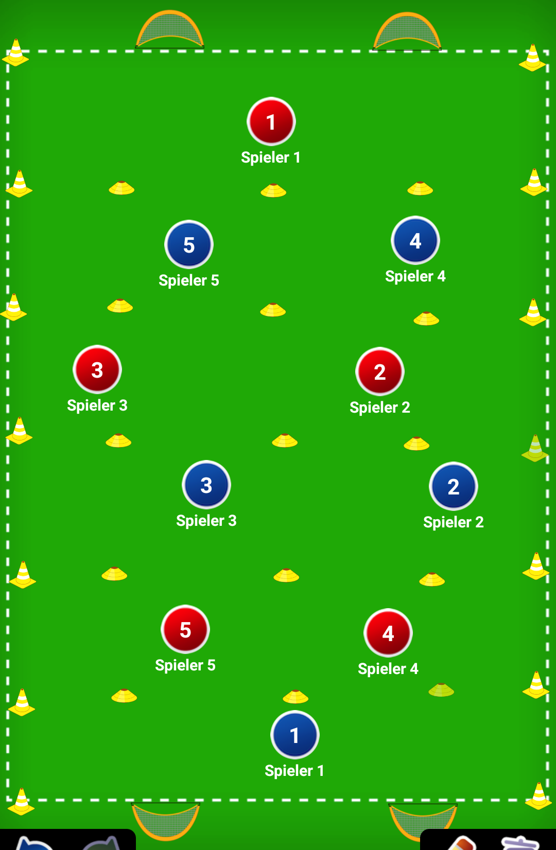 Der Ball muss von hinten nach vorne durch alle Zonen gepasst werden, um am Ende in eines der Tore gespielt zu werden.