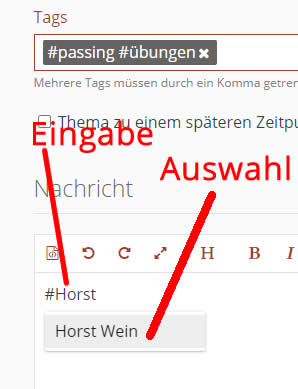 Wenn # eingegeben wird und dann die ersten drei Buchstaben, werden bereits genutzte Tags vorgeschlagen.