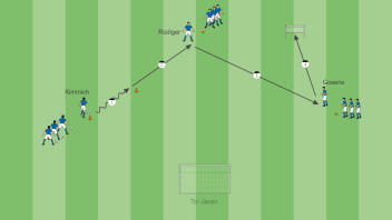 Ich hätte da auch gerne ein zweites Tor (z.B. Tor für Steckpass statt Rückpass), dann könnte Gosens je nach Pass von Rüdiger entscheiden welches er besser bedienen kann und es wäre weiterhin eine Übung. Will ich dann noch einen Wettkampf daraus machen um Zeitdruck zu simulieren, könnte man es 2x aufbauen und zeitgleich machen lassen.