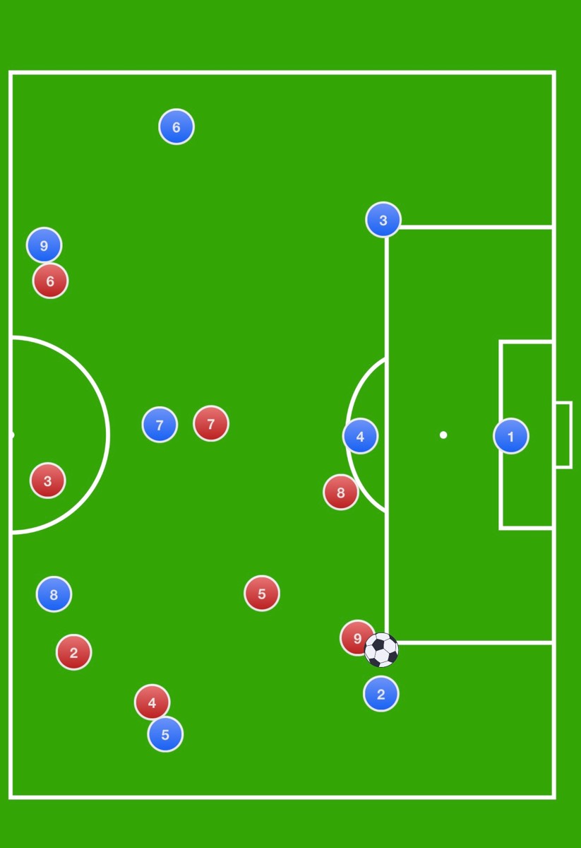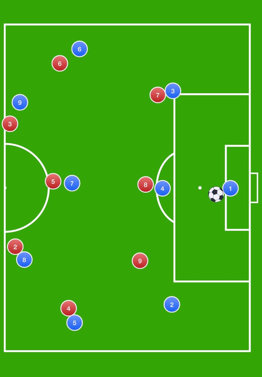 Leider findet man zum Thema Angriffspressing auf 9er Feld nicht sonderlich viel und ich weiß nicht, ob man das 11er Feld mit Viererkette eins zu eins auf unser 3-3-2 übertragen kann. Ich möchte wissen, wie sich jeder einzelne Spieler dabei verhält. Bei den anderen spielen ist mir die Laufrichtung klar, nur bei der Verteidigung noch nicht so ganz.