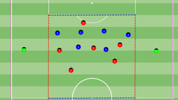Spielziel: Pass auf Stürmer. Dieser MUSS einen der Flügelspieler einsetzen. Danach dürfen alle in den gegnerischen Strafraum. Verteidigendes Team muss also Kompaktheit herstellen, um den Pass auf den Stürmer zu verhindern. Sobald das gescheitert ist, wird man überspielt und muss sich im Strafraum neu formieren, um die Hereingabe von Grün zu verhindern.