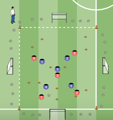Level 1: 5 gegen 5 auf 5 Durchgangstore (Feldgröße ca. 20x25 Meter)